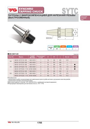SYNCHROTAPPING CHUCK SYTC ПАТРОНЫ С МИКРОКОМПЕНСАЦИЕЙ ДЛЯ НАРЕЗАНИЯ РЕЗЬБЫ (БЫСТРОСМЕННЫЕ) Патроны Synchroдля нарезания резьбы Ст. точн.DIN 69871конусаБалансир. G Частота вращ. Системаохлаждения - SK AT3 – – – ■DIN 69871-SK Ед.изм.:мм Конус № Модель РАЗМЕР ПодходящиеМЕТЧИКАвставкиd1 D1 L Вес (кг) В наличии SK30 SYTC12 65 M3~M12 1 19 36 65 0.5 30 SK30 SYTC20 89 M6~M24 2 31 50 89 1 SK40 SYTC12 65 M3~M12 1 19 36 65 1.1 ● 40 SK40 SYTC20 79 M6~M24 2 31 50 79 1.5 ● SK40 SYTC33 115 M18~M38 3 48 74 115 3.3 ● SK50 SYTC12 65 M3~M12 1 19 36 65 3 50 SK50 SYTC20 79 M6~M24 2 31 50 79 3.3 SK50 SYTC33 115 M18~M38 3 48 74 115 5.2 ▶Особенности: - компенсация ошибок синхронизации для увеличения срока службы метчика и улучшения качества резьбы - компенсация шаговых допусков метчиков ▶Доступны изделия с конусом САТ (ANSI B5.50) и с дюймовой системой измерения. ▶Подходящие переходники для метчиков см на сс. 1717~ 1718. 1705