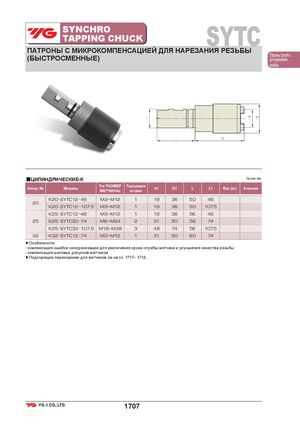 1 1 SYNCHROTAPPING CHUCK SYTC ПАТРОНЫ С МИКРОКОМПЕНСАЦИЕЙ ДЛЯ НАРЕЗАНИЯ РЕЗЬБЫ (БЫСТРОСМЕННЫЕ) Патроны Synchroдля нарезания резьбы 1 ■ЦИЛИНДРИЧЕСКИЕ-K Ед.изм.:мм Конус № Модель For РАЗМЕР ПодходящиеМЕТЧИКАsвставкиd1D1 L L1 Вес (кг) В наличии K20 SYTC12 46 M3~M12 1 19 36 50 46 20 K20 SYTC12 107.5 M3~M12 1 19 36 50 107.5 K25 SYTC12 46 M3~M12 1 19 36 56 46 25 K25 SYTC20 74 M6~M24 2 31 50 56 74 K25 SYTC33 107.5 M18~M38 3 48 74 56 107.5 32 K32 SYTC12 74 M3~M12 1 31 50 60 74 ▶Особенности: - компенсация ошибок синхронизации для увеличения срока службы метчика и улучшения качества резьбы - компенсация шаговых допусков метчиков ▶Подходящие переходники для метчиков см на сс. 1717~ 1718. 1707