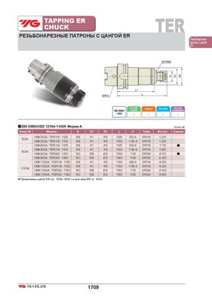 TAPPING ERCHUCK TER РЕЗЬБОНАРЕЗНЫЕ ПАТРОНЫ С ЦАНГОЙ ER Резьбонарезные патроны с цангой ER Ст. точн.DIN 69893конусаБалансир. G Частота вращ. Системаохлаждения - HSK – – – – ■DIN 69893/ISO 12164-1-HSK Форма A Ед.изм.:мм Конус № Модель D D1 D2 L L1 Гайка Вес (кг) В наличии HSK50A TER16 125 28 41 45 125 93.4 ER16 1.20 50A HSK50A TER16 150 28 41 45 150 118.4 ER16 1.30 HSK63A TER16 125 28 41 45 125 93.4 ER16 1.70 ● HSK63A TER16 150 28 41 45 150 118.4 ER16 1.85 63A HSK63A TER32 150 50 58 63 150 112 ER32 2.10 ● HSK63A TER32 180 50 58 63 180 142 ER32 2.30 HSK100A TER16 130 28 41 45 130 98.4 ER16 4.00 HSK100A TER16 150 28 41 45 150 118.4 ER16 4.20 100A HSK100A TER32 150 50 58 63 150 112 ER32 4.40 HSK100A TER32 180 50 58 63 180 142 ER32 4.60 ▶Применимы цанги ER (сс. 1638~1640 ) и метчики ER (с. 1641) 1709