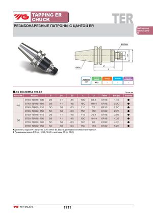 TAPPING ERCHUCK TER РЕЗЬБОНАРЕЗНЫЕ ПАТРОНЫ С ЦАНГОЙ ER Резьбонарезные патроны с цангой ER Ст. точн.JIS B6339конусаБалансир. G Частота вращ. Системаохлаждения - BT AT3 – – – ■JIS B6339/MAS 403-BT Ед.изм.:мм Конус № Модель D D1 D2 L L1 Гайка Вес (кг) В наличии BT40 TER16 100 28 41 45 100 68.4 ER16 1.45 ● BT40 TER16 150 28 41 45 150 118.4 ER16 2.00 ● 40 BT40 TER32 110 50 58 63 110 72 ER32 2.20 ● BT40 TER32 150 50 58 63 150 112 ER32 2.70 ● BT50 TER16 115 28 41 45 115 79.4 ER16 3.95 ● BT50 TER16 150 28 41 45 150 114.4 ER16 4.35 ● 50 BT50 TER32 120 50 58 63 120 83 ER32 4.70 ● BT50 TER32 150 50 58 63 150 113 ER32 5.20 ● ▶Доступны изделия с конусом САТ (ANSI B5.50) и с дюймовой системой измерения. ▶Применимы цанги ER (сс. 1638~1640 ) и метчики ER (с. 1641) 1711