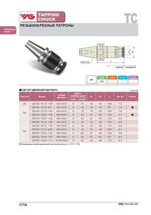TAPPINGCHUCK TC РЕЗЬБОНАРЕЗНЫЕ ПАТРОНЫ Резьбонарезные патроны Ст. точн.конусаБалансир. G Частота вращ. Системаохлаждения CBT AT3 – – – ■CBT (BT ДВОЙНОЙ КОНТАКТ) Ед.изм.:мм ДЛИНА Конус № Модель РАЗМЕР КОМПЕНСАЦИИМЕТЧИКА d1 D1 L Вес (кг) В наличии СЖАТ. НАТЯЖ. 30 CBT30 TC12 105 M3~M12 5 15 19 45 105 1.0 CBT40 TC12 90 M3~M12 5 15 19 45 90 1.5 ● CBT40 TC12 130 M3~M12 5 15 19 45 130 1.6 40 CBT40 TC24 100 M6~M24 5 20 31 63 100 2.1 ● CBT40 TC24 142 M6~M24 5 20 31 63 142 2.9 CBT50 TC12 130 M3~M12 5 15 19 45 130 4.2 CBT50 TC12 175 M3~M12 5 15 19 45 175 4.8 CBT50 TC12 220 M3~M12 5 15 19 45 220 5.1 50 CBT50 TC24 142 M6~M24 5 20 31 63 142 5.8 CBT50 TC24 187 M6~M24 5 20 31 63 187 6.0 CBT50 TC38 175 M18~M38 10 25 48 98 175 8.3 ▶Подходящие переходники для метчиков см на сс. 1717~ 1718. 1714