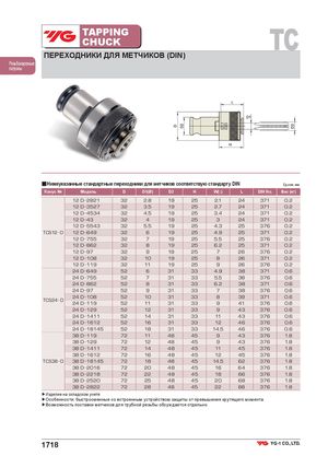 TAPPINGCHUCK TC ПЕРЕХОДНИКИ ДЛЯ МЕТЧИКОВ (DIN) Резьбонарезные патроны ■Нижеуказанные стандартные переходники для метчиков соответствую стандарту DIN Ед.изм.:мм Конус № Модель D D1(Ø) D2 H W(□) L DIN No. Вес (кг) 12 D 2821 32 2.8 19 25 2.1 24 371 0.2 12 D 3527 32 3.5 19 25 2.7 24 371 0.2 12 D 4534 32 4.5 19 25 3.4 24 371 0.2 12 D 43 32 4 19 25 3 24 371 0.2 12 D 5543 32 5.5 19 25 4.3 25 376 0.2 TCS12 D 12 D 649 32 6 19 25 4.9 25 371 0.2 12 D 755 32 7 19 25 5.5 25 376 0.2 12 D 862 32 8 19 25 6.2 25 371 0.2 12 D 97 32 9 19 25 7 26 376 0.2 12 D 108 32 10 19 25 8 26 371 0.2 12 D 119 32 11 19 25 9 26 376 0.2 24 D 649 52 6 31 33 4.9 38 371 0.6 24 D 755 52 7 31 33 5.5 38 376 0.6 24 D 862 52 8 31 33 6.2 38 371 0.6 24 D 97 52 9 31 33 7 38 376 0.6 24 D 108 52 10 31 33 8 39 371 0.6 TCS24 D 24 D 119 52 11 31 33 9 41 376 0.6 24 D 129 52 12 31 33 9 43 376 0.6 24 D 1411 52 14 31 33 11 43 376 0.6 24 D 1612 52 16 31 33 12 46 376 0.6 24 D 18145 52 18 31 33 14.5 46 376 0.6 38 D 119 72 11 48 45 9 43 376 1.8 38 D 129 72 12 48 45 9 43 376 1.8 38 D 1411 72 14 48 45 11 45 376 1.8 38 D 1612 72 16 48 45 12 45 376 1.8 TCS38 D 38 D 18145 72 18 48 45 14.5 62 376 1.8 38 D 2016 72 20 48 45 16 64 376 1.8 38 D 2218 72 22 48 45 18 66 376 1.8 38 D 2520 72 25 48 45 20 68 376 1.8 38 D 2822 72 28 48 45 22 68 376 1.8 ▶Изделие на складском учете ▶Особенности: быстросменные со встроенным устройством защиты от превышения крутящего момента ▶Возможность поставки метчиков для трубной резьбы обсуждается отдельно 1718
