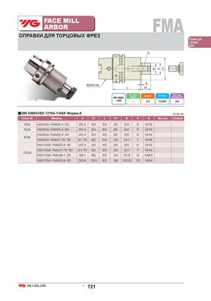 FACE MILLARBOR FMA ОПРАВКИ ДЛЯ ТОРЦОВЫХ ФРЕЗ Оправки для торцовых фрез Ст. точн.DIN 69893конусаБалансир. G Частота вращ. Системаохлаждения - HSK – 6.3 15,000 AD ■DIN 69893/ISO 12164-1-HSK Форма A Ед.изм.:мм Конус № Модель D C1 L H1 B K G Вес (кг) В наличии 40A HSK40A FMA25.4 50 25.4 50 50 22 9.5 5 M12 50A HSK50A FMA25.4 60 25.4 50 60 22 9.5 5 M12 HSK63A FMA25.4 45 25.4 50 45 22 9.5 5 M12 63A HSK63A FMA31.75 50 31.75 60 50 30 12.7 7 M16 HSK100A FMA25.4 45 25.4 50 45 22 9.5 5 M12 HSK100A FMA31.75 50 31.75 60 50 30 12.7 7 M16 100A HSK100A FMA38.1 55 38.1 80 55 34 15.9 9 M20 HSK100A FMA50.8 60 50.8 100 60 36 19.05 10 M24 • 721