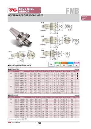 FACE MILLARBOR FMB ОПРАВКИ ДЛЯ ТОРЦОВЫХ ФРЕЗ Оправки для торцовых фрез Рис.1 Рис.2 Рис.4 Рис.3 Ст. точн.конусаБалансир. G Частота вращ. Системаохлаждения CBT ■CBT (BT ДВОЙНОЙ КОНТАКТ) AT3 2.5 25,000 AD ◆МЕТРИЧЕСКИЕ Ед.изм.:мм Конус № Модель D L C1 C2 H1 H2 W K G Рис. Вес (кг) В наличии 30 CBT30 FMB27 45 27 45 80 26 12 6 M12 4 2.1 ● CBT40 FMB27 60 27 60 80 26 12 6 M12 4 2.5 ● 40 CBT40 FMB27 90 27 90 80 26 12 6 M12 4 4.7 ● CBT40 FMB40 60 40 60 85 28 26 6 16 8.5 M20 4 7.4 ● CBT50 FMB27 45 27 45 80 26 12 6 M12 1 4.0 CBT50 FMB27 90 27 90 80 26 12 6 M12 1 5.8 CBT50 FMB27 150 27 150 80 26 12 6 M12 1 8.2 CBT50 FMB40 45 40 45 85 28 26 6 16 8.5 M20 1 4.7 50 CBT50 FMB40 75 40 75 85 28 26 6 16 8.5 M20 1 6.1 CBT50 FMB40 105 40 105 85 28 26 6 16 8.5 M20 1 8.1 CBT50 FMB40F 75 40 75 110 28 26 6 16 8.5 M20 2 6.6 CBT50 FMB60 75 60 75 140 25 25.4 12.5 3 7.9 ◆ДЮЙМОВЫЕ Ед.изм.:мм Конус № Модель D L C1 C2 H1 H2 W K G Рис. Вес (кг) В наличии 30 CBT30 FMB25.4 40 25.4 40 80 26 9.5 5 M12 4 2.1 CBT40 FMB25.4 60 25.4 60 80 26 9.5 5 M12 4 2.5 40 CBT40 FMB25.4 90 25.4 90 80 26 9.5 5 M12 4 4.7 CBT40 FMB38.1 60 38.1 60 85 28 26 6 15.9 9 M20 4 7.4 CBT50 FMB25.4 45 25.4 45 80 26 9.5 5 M12 1 4.0 CBT50 FMB25.4 90 25.4 90 80 26 9.5 5 M12 1 5.8 CBT50 FMB25.4 150 25.4 150 80 26 9.5 5 M12 1 8.2 50 CBT50 FMB38.1 45 38.1 45 85 28 26 6 15.9 9 M20 1 4.7 CBT50 FMB38.1 75 38.1 75 85 28 26 6 15.9 9 M20 1 6.1 CBT50 FMB38.1 105 38.1 105 85 28 26 6 15.9 9 M20 1 8.7 CBT50 FMB38.1F 75 38.1 75 110 28 26 6 15.9 9 M20 2 6.6 ▶Запасные детали см. на с. 1728 • 723