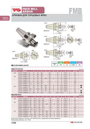 FACE MILLARBOR FMB ОПРАВКИ ДЛЯ ТОРЦОВЫХ ФРЕЗ Оправки для торцовых фрез Рис.1 Рис.2 Рис.4 Рис.3 Ст. точн.JIS B6339конусаБалансир. G Частота вращ. Системаохлаждения ■JIS B6339/MAS 403-BT - BT AT3 6.3 15,000 AD ◆МЕТРИЧЕСКИЕ Ед.изм.:мм Конус № Модель D L C1 C2 H1 H2 W K G Рис. Вес (кг) В наличии 30 BT30 FMB27 45 27 45 80 26 12 6 M12 4 2.1 BT40 FMB27 60 27 60 80 26 12 6 M12 4 2.5 40 BT40 FMB27 90 27 90 80 26 12 6 M12 4 4.7 BT40 FMB40 60 40 60 85 28 26 6 16 8.5 M20 4 7.4 BT50 FMB27 45 27 45 80 26 12 6 M12 1 4.0 BT50 FMB27 90 27 90 80 26 12 6 M12 1 5.8 BT50 FMB27 150 27 150 80 26 12 6 M12 1 8.2 BT50 FMB40 45 40 45 85 28 26 6 16 8.5 M20 1 4.7 ● 50 BT50 FMB40 75 40 75 85 28 26 6 16 8.5 M20 1 6.1 ● BT50 FMB40 105 40 105 85 28 26 6 16 8.5 M20 1 8.1 BT50 FMB40F 75 40 75 110 28 26 6 16 8.5 M20 2 6.6 ● BT50 FMB60 75 60 75 140 25 25.4 12.5 3 7.9 ● ◆ДЮЙМОВЫЕ Ед.изм.:мм Конус № Модель D L C1 C2 H1 H2 W K G Рис. Вес (кг) В наличии 30 BT30 FMB25.4 40 25.4 40 80 26 9.5 5 M12 4 2.1 BT40 FMB25.4 60 25.4 60 80 26 9.5 5 M12 4 2.5 40 BT40 FMB25.4 90 25.4 90 80 26 9.5 5 M12 4 4.7 BT40 FMB38.1 60 38.1 60 85 28 26 6 15.9 9 M20 4 7.4 BT50 FMB25.4 45 25.4 45 80 26 9.5 5 M12 1 4.0 BT50 FMB25.4 90 25.4 90 80 26 9.5 5 M12 1 5.8 BT50 FMB25.4 150 25.4 150 80 26 9.5 5 M12 1 8.2 50 BT50 FMB38.1 45 38.1 45 85 28 26 6 15.9 9 M20 1 4.7 BT50 FMB38.1 75 38.1 75 85 28 26 6 15.9 9 M20 1 6.1 BT50 FMB38.1 105 38.1 105 85 28 26 6 15.9 9 M20 1 8.7 BT50 FMB38.1F 75 38.1 75 110 28 26 6 15.9 9 M20 2 6.6 ▶Доступны изделия с конусом САТ (ANSI B5.50) и с дюймовой системой измерения. ▶Запасные детали см. на с. 1728 1724