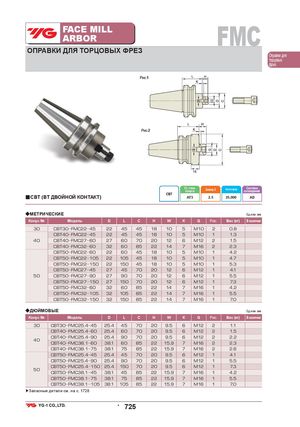 FACE MILLARBOR FMC ОПРАВКИ ДЛЯ ТОРЦОВЫХ ФРЕЗ Оправки для торцовых фрез Рис.1 Рис.2 Ст. точн.конусаБалансир. G Частота вращ. Системаохлаждения CBT ■CBT (BT ДВОЙНОЙ КОНТАКТ) AT3 2.5 25,000 AD ◆МЕТРИЧЕСКИЕ Ед.изм.:мм Конус № Модель D L C H W K G Рис. Вес (кг) В наличии 30 CBT30 FMC22 45 22 45 45 18 10 5 M10 2 0.8 CBT40 FMC22 45 22 45 45 18 10 5 M10 1 1.3 40 CBT40 FMC27 60 27 60 70 20 12 6 M12 2 1.5 CBT40 FMC32 60 32 60 85 22 14 7 M16 2 2.3 CBT50 FMC22 60 22 60 45 18 10 5 M10 1 4.2 CBT50 FMC22 105 22 105 45 18 10 5 M10 1 4.7 CBT50 FMC22 150 22 150 45 18 10 5 M10 1 5.3 CBT50 FMC27 45 27 45 70 20 12 6 M12 1 4.1 50 CBT50 FMC27 90 27 90 70 20 12 6 M12 1 5.5 CBT50 FMC27 150 27 150 70 20 12 6 M12 1 7.3 CBT50 FMC32 60 32 60 85 22 14 7 M16 1 4.2 CBT50 FMC32 105 32 105 85 22 14 7 M16 1 5.5 CBT50 FMC32 150 32 150 85 22 14 7 M16 1 7.0 ◆ДЮЙМОВЫЕ Ед.изм.:мм Конус № Модель D L C H W K G Рис. Вес (кг) В наличии 30 CBT30 FMC25.4 45 25.4 45 70 20 9.5 6 M12 2 1.1 CBT40 FMC25.4 60 25.4 60 70 20 9.5 6 M12 2 1.5 40 CBT40 FMC25.4 90 25.4 90 70 20 9.5 6 M12 2 2.2 CBT40 FMC38.1 60 38.1 60 85 22 15.9 7 M16 2 2.3 CBT40 FMC38.1 75 38.1 75 85 22 15.9 7 M16 2 2.6 CBT50 FMC25.4 45 25.4 45 70 20 9.5 6 M12 1 4.1 CBT50 FMC25.4 90 25.4 90 70 20 9.5 6 M12 1 5.5 CBT50 FMC25.4 150 25.4 150 70 20 9.5 6 M12 1 7.3 50 CBT50 FMC38.1 45 38.1 45 85 22 15.9 7 M16 1 4.2 CBT50 FMC38.1 75 38.1 75 85 22 15.9 7 M16 1 5.5 CBT50 FMC38.1 105 38.1 105 85 22 15.9 7 M16 1 7.0 ▶Запасные детали см. на с. 1728 • 725