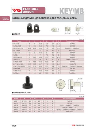 FACE MILLARBOR KEY/MB Оправки дляторцовых фрезЗАПАСНЫЕ ДЕТАЛИ (ДЛЯ ОПРАВОК ДЛЯ ТОРЦОВЫХ ФРЕЗ) ■ШПОНКА Ед.изм.:мм Размер W K L D1 D2 A Подходящая оправка 8х7х12.8 8 7 12.8 5.8 3.2 3.2 SMA16 10х7.8х15.5 10 7.8 15.5 7.5 4.2 4.3 SMA22 9.52х9.52х10.2 9.52 9.52 10.2 7.5 4.5 5.2 FMA25.4 / FMB25.4 9.5х12х11 9.5 12 11 7.5 4.2 5 FMC25.4 12х9х18.5 12 9 18.5 9 5.3 5.5 SMA27 10х10х11 10 10 11 7.5 4.2 5 FMC22 14х11.5х20.5 14 11.5 20.5 10.5 6.5 6.5 SMA32 12х13х18 12 13 18 9 5.3 8 FMB27 / FMC27 16х13.5х23.5 16 13.5 23.5 10.5 6.5 6.5 SMA40 12.7х12.7х12.7 12.7 12.7 12.7 7.5 4.5 5.2 FMA31.75 15.87х15.87х18.5 15.87 15.87 18.5 10.3 6.6 7.5 FMA38.1 / FMB40 / FMB40F 14х15х20 14 15 20 10.5 6.3 8 FMC32 18х18х28.5 18 18 28.5 10.5 6.5 10 SMA50 19х18х22 19 18 22 10.5 6.3 7 FMA50.8 ■УСТАНОВОЧНЫЙ БОЛТ Ед.изм.:мм Размер M D D1 L A B W Подходящая оправка MB8 8х1.25 20 15 23 7 2 6 FMC16 MB10 10х1.5 28 18 29 9 2 8 FMC22 MB12 12х1.75 33 23 32 10 2 10 FMC27 / FMB27 / FMA25.4 MB16 16х2.0 40 23 42 10 6 12 FMC32 / FMA3.1.75 MB20 20х2.5 50 27 54 14 6 14 FMC40 / FMA38.1 / FMB40 / FMB40F MB24 24х3.0 65 37 62 14 10 17 FMA50.8 1728