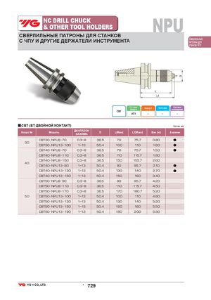NC DRILL CHUCK& OTHER TOOL HOLDERS NPU СВЕРЛИЛЬНЫЕ ПАТРОНЫ ДЛЯ СТАНКОВ С ЧПУ И ДРУГИЕ ДЕРЖАТЕЛИ ИНСТРУМЕНТА Сверлильныепатроны для станков ЧПУ Ст. точн.конусаБалансир. G Частота вращ. Системаохлаждения CBT AT3 – – – ■CBT (BT ДВОЙНОЙ КОНТАКТ) Ед.изм.:мм Конус № Модель ДИАПАЗОНЗАЖИМА D L(Мин) L1(Макс) Вес (кг) В наличии CBT30 NPU8 70 0.3~8 36.5 70 75.7 0.80 ● 30 CBT30 NPU13 100 1~13 50.4 100 110 1.80 ● CBT40 NPU8 70 0.3~8 36.5 70 75.7 1.50 ● CBT40 NPU8 110 0.3~8 36.5 110 115.7 1.80 CBT40 NPU8 150 0.3~8 36.5 150 155.7 2.60 40 CBT40 NPU13 90 1~13 50.4 90 95.7 2.10 ● CBT40 NPU13 130 1~13 50.4 130 140 2.70 ● CBT40 NPU13 150 1~13 50.4 150 160 3.40 CBT50 NPU8 90 0.3~8 36.5 90 95.7 4.20 CBT50 NPU8 110 0.3~8 36.5 110 115.7 4.50 CBT50 NPU8 170 0.3~8 36.5 170 180.7 5.20 50 CBT50 NPU13 100 1~13 50.4 100 110 4.80 CBT50 NPU13 130 1~13 50.4 130 140 5.20 CBT50 NPU13 150 1~13 50.4 150 160 5.50 CBT50 NPU13 190 1~13 50.4 190 200 5.90 • 729