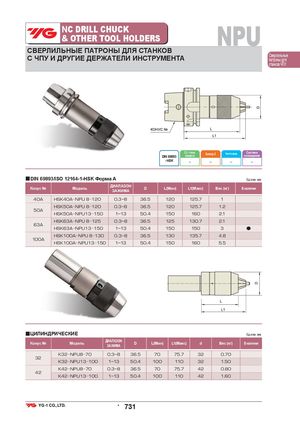 NC DRILL CHUCK& OTHER TOOL HOLDERS NPU СВЕРЛИЛЬНЫЕ ПАТРОНЫ ДЛЯ СТАНКОВ С ЧПУ И ДРУГИЕ ДЕРЖАТЕЛИ ИНСТРУМЕНТА Сверлильныепатроны для станков ЧПУ Ст. точн.DIN 69893конусаБалансир. G Частота вращ. Системаохлаждения - HSK – – – – ■DIN 69893/ISO 12164-1-HSK Форма A Ед.изм.:мм Конус № Модель ДИАПАЗОНЗАЖИМА D L(Мин) L1(Макс) Вес (кг) В наличии 40A HSK40A NPU 8 120 0.3~8 36.5 120 125.7 1 HSK50A NPU 8 120 0.3~8 36.5 120 125.7 1.2 50A HSK50A NPU13 150 1~13 50.4 150 160 2.1 HSK63A NPU 8 125 0.3~8 36.5 125 130.7 2.1 63A HSK63A NPU13 150 1~13 50.4 150 150 3 ● HSK100A NPU 8 130 0.3~8 36.5 130 135.7 4.8 100A HSK100A NPU13 150 1~13 50.4 150 160 5.5 ■ЦИЛИНДРИЧЕСКИЕ Ед.изм.:мм Конус № Модель ДИАПАЗОНЗАЖИМАD L(Мин) L1(Макс) d Вес (кг) В наличии K32 NPU8 70 0.3~8 36.5 70 75.7 32 0.70 32 K32 NPU13 100 1~13 50.4 100 110 32 1.50 K42 NPU8 70 0.3~8 36.5 70 75.7 42 0.80 42 K42 NPU13 100 1~13 50.4 100 110 42 1.60 • 731