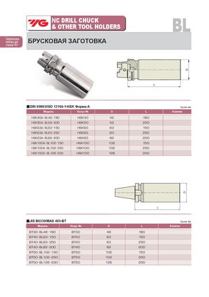 D D NC DRILL CHUCK& OTHER TOOL HOLDERS BL Сверлильныепатроны дляБРУСКОВАЯ ЗАГОТОВКА станков ЧПУ L ■DIN 69893/ISO 12164-1-HSK Форма A Ед.изм.:мм Модель Конус № D L В наличии HSK40A BL42 180 HSK40 42 180 HSK50A BL52 200 HSK50 52 200 HSK63A BL63 150 HSK63 63 150 HSK63A BL63 250 HSK63 63 250 HSK63A BL82 200 HSK63 82 200 HSK100A BL102 150 HSK100 102 150 HSK100A BL102 250 HSK100 102 250 HSK100A BL126 200 HSK100 126 200 L ■JIS B6339/MAS 403-BT Ед.изм.:мм Модель Конус № D L В наличии BT30 BL48 180 BT30 48 180 BT40 BL63 150 BT40 63 150 BT40 BL63 250 BT40 63 250 BT40 BL82 200 BT40 82 200 BT50 BL102 150 BT50 102 150 BT50 BL102 250 BT50 102 250 BT50 BL126 200 BT50 126 200