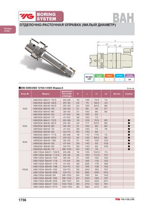 BORINGSYSTEM BAH ОТДЕЛОЧНО-РАСТОЧНАЯ ОПРАВКА (МАЛЫЙ ДИАМЕТР) Расточные системы Ст. точн.DIN 69893конусаБалансир. G Частота вращ. Системаохлаждения - HSK – – – AD ■DIN 69893/ISO 12164-1-HSK Форма A Ед.изм.:мм ДИАПАЗОН Конус № Модель РАСТОЧКИ D L L1 L2 Вес (кг) В наличии (СПЕРЕДИ) HSK40A BAH1 72.5 20~26 19 105 72.5 73 HSK40A BAH2 39.5 25~33 24 75 39.5 44 HSK40A BAH2 84.5 25~33 24 120 84.5 89 40A HSK40A BAH3 45 32~42 31 85 45 57 HSK40A BAH3 80 32~42 31 120 80 92 HSK40A BAH4 53 41~54 39 100 53 HSK40A BAH4 73 41~54 39 120 73 HSK50A BAH1 72.5 20~26 19 105 72.5 65 ● HSK50A BAH2 84.5 25~33 24 117 84.5 80 ● 50A HSK50A BAH3 80 32~42 31 120 80 82 ● HSK50A BAH4 73 41~54 39 120 73 76 ● HSK50A BAH5 83 53~70 50 140 83 ● HSK63A BAH1 77.5 20~26 19 110 77.5 73 ● HSK63A BAH2 89.5 25~33 24 125 89.5 88 ● HSK63A BAH3 100 32~42 31 140 100 103 ● 63A HSK63A BAH4 93 41~54 39 140 93 103 ● HSK63A BAH5 83 53~70 50 140 83 105 ● HSK63A BAH6 79 68~100 64 150 79 ● HSK100A BAH1 102.5 20~26 19 135 102.5 73 HSK100A BAH2 114.5 25~33 24 150 114.5 107 HSK100A BAH3 125 32~42 31 165 125 122 HSK100A BAH4 118 41~54 39 165 118 122 HSK100A BAH4 178 41~54 39 225 178 182 HSK100A BAH5 108 53~70 50 165 108 122 100A HSK100A BAH5 183 53~70 50 240 183 197 HSK100A BAH5 228 53~70 50 285 228 242 HSK100A BAH6 94 68~100 64 165 94 122 HSK100A BAH6 169 68~100 64 240 169 197 HSK100A BAH6 229 68~100 64 300 229 257 HSK100A BAH7 123 100~153 90 210 123 181 HSK100A BAH7 273 100~153 90 360 273 331 1736