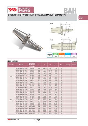 BORINGSYSTEM BAH ОТДЕЛОЧНО-РАСТОЧНАЯ ОПРАВКА (МАЛЫЙ ДИАМЕТР) Расточные системы Рис. 1 Рис. 2 Ст. точн.DIN 69871конусаБалансир. G Частота вращ. Системаохлаждения - SK AT3 – – AD ■DIN 69871-SK Ед.изм.:мм ДИАПАЗОН Конус № Модель РАСТОЧКИ D L L1 L2 Рис. Вес (кг) В наличии (СПЕРЕДИ) SK40 BAH1 105 20~26 19 104.5 72 73 2 SK40 BAH2 80 25~33 24 78 42.5 48 2 SK40 BAH2 120 25~33 24 118 82.5 88 2 SK40 BAH3 85 32~42 31 84 44 53 2 SK40 BAH3 135 32~42 31 134 94 103 2 40 SK40 BAH4 90 41~54 39 90 43 58 2 SK40 BAH4 135 41~54 39 135 88 103 2 SK40 BAH5 105 53~70 50 105 48 73 2 SK40 BAH5 135 53~70 50 135 79 103 2 SK40 BAH6 135 68~100 64 135 64 103 2 SK50 BAH1 135 20~26 19 134.5 102 73 1 SK50 BAH2 90 25~33 24 88 52.5 66 2 SK50 BAH2 150 25~33 24 148 112.5 126 2 SK50 BAH3 95 32~42 31 94 54 71 2 SK50 BAH3 165 32~42 31 164 124 141 2 SK50 BAH4 105 41~54 39 105 58 81 2 SK50 BAH4 165 41~54 39 165 118 141 2 SK50 BAH4 225 41~54 39 225 178 201 2 50 SK50 BAH5 120 53~70 50 120 63 96 2 SK50 BAH5 165 53~70 50 165 105 141 2 SK50 BAH5 240 53~70 50 240 183 216 2 SK50 BAH5 285 53~70 50 285 228 261 2 SK50 BAH6 165 68~100 64 165 94 141 2 SK50 BAH6 240 68~100 64 240 169 216 2 SK50 BAH6 300 68~100 64 300 229 276 2 SK50 BAH7 210 100~153 90 210 93 191 2 SK50 BAH7 360 100~153 90 360 243 341 2 • 737