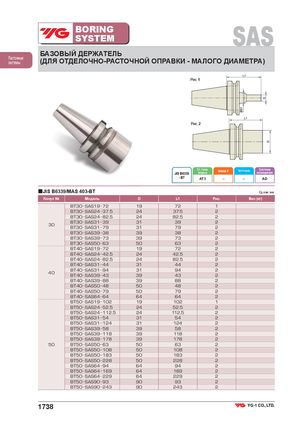 BORINGSYSTEM SAS БАЗОВЫЙ ДЕРЖАТЕЛЬ Расточныесистемы(ДЛЯ ОТДЕЛОЧНО-РАСТОЧНОЙ ОПРАВКИ - МАЛОГО ДИАМЕТРА) Рис. 1 Рис. 2 Ст. точн.JIS B6339конусаБалансир. G Частота вращ. Системаохлаждения - BT AT3 – – AD ■JIS B6339/MAS 403-BT Ед.изм.:мм Конус № Модель D L1 Рис. Вес (кг) BT30 SAS19 72 19 72 1 BT30 SAS24 37.5 24 37.5 2 BT30 SAS24 82.5 24 82.5 2 30 BT30 SAS31 39BT30SAS3179 3131 3979 22 BT30 SAS39 38 39 38 2 BT30 SAS39 73 39 73 2 BT30 SAS50 63 50 63 2 BT40 SAS19 72 19 72 2 BT40 SAS24 42.5 24 42.5 2 BT40 SAS24 82.5 24 82.5 2 BT40 SAS31 44 31 44 2 40 BT40 SAS31 94BT40SAS3943 3139 9443 22 BT40 SAS39 88 39 88 2 BT40 SAS50 48 50 48 2 BT40 SAS50 79 50 79 2 BT40 SAS64 64 64 64 2 BT50 SAS19 102 19 102 1 BT50 SAS24 52.5 24 52.5 2 BT50 SAS24 112.5 24 112.5 2 BT50 SAS31 54 31 54 2 BT50 SAS31 124 31 124 2 BT50 SAS39 58 39 58 2 BT50 SAS39 118 39 118 2 BT50 SAS39 178 39 178 2 50 BT50 SAS50 63 50 63 2 BT50 SAS50 108 50 108 2 BT50 SAS50 183 50 183 2 BT50 SAS50 228 50 228 2 BT50 SAS64 94 64 94 2 BT50 SAS64 169 64 169 2 BT50 SAS64 229 64 229 2 BT50 SAS90 93 90 93 2 BT50 SAS90 243 90 243 2 1738