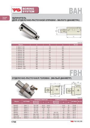 BORINGSYSTEM BAH РасточныесистемыУДЛИНИТЕЛЬ (ДЛЯ ОТДЕЛОЧНО-РАСТОЧНОЙ ОПРАВКИ - МАЛОГО ДИАМЕТРА) Ед.изм.:мм Модель d D L Вес (кг) E BAH1 20 11 19 20 E BAH1 30 11 19 30 E BAH2 30 14 24 30 E BAH2 45 14 24 45 E BAH3 30 18 31 30 E BAH3 45 18 31 45 E BAH4 45 22 39 45 E BAH4 60 22 39 60 E BAH5 60 28 50 60 E BAH5 90 28 50 90 E BAH6 60 36 64 60 E BAH6 100 36 64 100 E BAH7 105 46 90 105 FBH ОТДЕЛОЧНО-РАСТОЧНАЯ ГОЛОВКА (МАЛЫЙ ДИАМЕТР) Ед.изм.:мм ПЕРЕДНЕЕ ОТВЕРСТИЕ ЗАДНЕЕ ОТВЕРСТИЕ Модель КАРТРИДЖ ДИАПАЗОНРАСТОЧКИ L L1 ДИАПАЗОНРАСТОЧКИ L2 ВСТАВКА Вес (кг)L3 FBH20 FBH1 1 20~26 32.5 29.5 10.5 19 TP08 FBH25 FBH2 1 25~33 35.5 32.5 10.5 19 TP08 FBH32 FBH3 1 32~42 40 35 10 25 TP08 FBH41 FBH4 1 41~54 47 43 14 29 TP11 FBH53 FBH5 1 53~70 57 53 52~70 19 34 TP11 FBH68 FBH6 1 68~100 71 67.2 80~100 22 45.2 TP11 FBH100 FBH6 1 100~153 71 67.2 112~153 22 45.2 TP11 FBH100 2 FBH6 1 100~153 87 83.2 112~153 38 45.2 TP11 1740