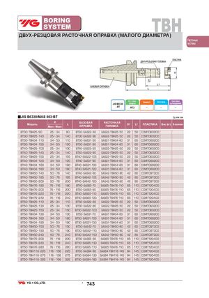 BORINGSYSTEM TBH ДВУХ-РЕЗЦОВАЯ РАСТОЧНАЯ ОПРАВКА (МАЛОГО ДИАМЕТРА) Расточные системы Ст. точн.JIS B6339конусаБалансир. G Частота вращ. Системаохлаждения - BT AT3 – – – ■JIS B6339/MAS 403-BT Ед.изм.:мм Модель D LМин - МаксБАЗОВАЯОПРАВКА РАСТОЧНАЯГОЛОВКА D1 L1 ПЛАСТИНА Вес (кг) В наличии BT30 TBH25 90 25 34 90 BT30 SAS22 40 SAS22 TBH25 50 22 50 CCMT060200 BT30 TBH25 140 25 34 140 BT30 SAS22 90 SAS22 TBH25 50 22 50 CCMT060200 BT30 TBH34 110 34 50 110 BT30 SAS31 50 SAS31 TBH34 60 31 60 CCMT060200 BT30 TBH34 150 34 50 150 BT30 SAS31 90 SAS31 TBH34 60 31 60 CCMT060200 BT40 TBH25 100 25 34 100 BT40 SAS22 50 SAS22 TBH25 50 22 50 CCMT060200 BT40 TBH25 140 25 34 140 BT40 SAS22 90 SAS22 TBH25 50 22 50 CCMT060200 BT40 TBH25 155 25 34 155 BT40 SAS22 105 SAS22 TBH25 50 22 50 CCMT060200 BT40 TBH34 120 34 50 120 BT40 SAS31 60 SAS31 TBH34 60 31 60 CCMT060200 BT40 TBH34 160 34 50 160 BT40 SAS31 100 SAS31 TBH34 60 31 60 CCMT060200 BT40 TBH34 180 34 50 180 BT40 SAS31 120 SAS31 TBH34 60 31 60 CCMT060200 BT40 TBH50 140 50 76 140 BT40 SAS42 60 SAS42 TBH50 80 42 80 CCMT09T300 BT40 TBH50 185 50 76 185 BT40 SAS42 105 SAS42 TBH50 80 42 80 CCMT09T300 BT40 TBH50 200 50 76 200 BT40 SAS42 120 SAS42 TBH50 80 42 80 CCMT09T300 BT40 TBH76 180 76 116 180 BT40 SAS65 70 SAS65 TBH76 110 65 110 CCMT120400 BT40 TBH76 200 76 116 200 BT40 SAS65 90 SAS65 TBH76 110 65 110 CCMT120400 BT40 TBH76 220 76 116 220 BT40 SAS65 110 SAS65 TBH76 110 65 110 CCMT120400 BT40 TBH76 240 76 116 240 BT40 SAS65 130 SAS65 TBH76 110 65 110 CCMT120400 BT50 TBH25 110 25 34 110 BT50 SAS22 60 SAS22 TBH25 50 22 50 CCMT060200 BT50 TBH25 130 25 34 130 BT50 SAS22 80 SAS22 TBH25 50 22 50 CCMT060200 BT50 TBH25 150 25 34 150 BT50 SAS22 100 SAS22 TBH25 50 22 50 CCMT060200 BT50 TBH34 130 34 50 130 BT50 SAS31 70 SAS31 TBH34 60 31 60 CCMT060200 BT50 TBH34 160 34 50 160 BT50 SAS31 100 SAS31 TBH34 60 31 60 CCMT060200 BT50 TBH34 190 34 50 190 BT50 SAS31 130 SAS31 TBH34 60 31 60 CCMT060200 BT50 TBH50 150 50 76 150 BT50 SAS42 70 SAS42 TBH50 80 42 80 CCMT09T300 BT50 TBH50 190 50 76 190 BT50 SAS42 110 SAS42 TBH50 80 42 80 CCMT09T300 BT50 TBH50 240 50 76 240 BT50 SAS42 150 SAS42 TBH50 80 42 80 CCMT09T300 BT50 TBH76 200 76 116 200 BT50 SAS65 90 SAS65 TBH76 110 65 110 CCMT120400 BT50 TBH76 240 76 116 240 BT50 SAS65 130 SAS65 TBH76 110 65 110 CCMT120400 BT50 TBH76 280 76 116 280 BT50 SAS65 170 SAS65 TBH76 110 65 110 CCMT120400 BT50 TBH116 225 116 156 225 BT50 SAS84 80 SAS84 TBH116 145 84 145 CCMT120400 BT50 TBH116 275 116 156 275 BT50 SAS84 130 SAS84 TBH116 145 84 145 CCMT120400 BT50 TBH116 325 116 156 325 BT50 SAS84 180 SAS84 TBH116 145 84 145 CCMT120400 • 743