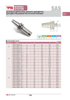 BORINGSYSTEM SAS БАЗОВЫЙ ДЕРЖАТЕЛЬ (МАЛОГО ДИАМЕТРА) ДЛЯ ДВУХ-РЕЗЦОВОЙ РАСТОЧНОЙ ОПРАВКИ Расточные системы Ст. точн.JIS B6339конусаБалансир. G Частота вращ. Системаохлаждения - BT AT3 – – – ■JIS B6339/MAS 403-BT Ед.изм.:мм Конус № Модель d1 D1 L G Вес (кг) BT30 SAS22 40 11 22 40 M5 0.30 BT30 SAS22 90 11 22 90 M5 0.40 30 BT30 SAS31 50 18 31 50 M8 0.40 BT30 SAS31 90 18 31 90 M8 0.50 BT40 SAS22 50 11 22 50 M5 1.70 BT40 SAS22 90 11 22 90 M5 1.90 BT40 SAS22 105 11 22 105 M5 1.90 BT40 SAS31 60 18 31 60 M8 1.90 BT40 SAS31 100 18 31 100 M8 2.30 BT40 SAS31 120 18 31 120 M8 2.40 40 BT40 SAS42 60 24 42 60 M10 2.70 BT40 SAS42 105 24 42 105 M10 2.90 BT40 SAS42 120 24 42 120 M10 3.10 BT40 SAS65 70 34 65 70 M16 3.30 BT40 SAS65 90 34 65 90 M16 3.60 BT40 SAS65 110 34 65 110 M16 4.60 BT40 SAS65 130 34 65 130 M16 4.70 BT50 SAS22 60 11 22 60 M5 4.30 BT50 SAS22 80 11 22 80 M5 4.50 BT50 SAS22 100 11 22 100 M5 4.70 BT50 SAS31 70 18 31 70 M8 4.50 BT50 SAS31 100 18 31 100 M8 5.10 BT50 SAS31 130 18 31 130 M8 5.40 BT50 SAS42 70 24 42 70 M10 5.00 50 BT50 SAS42 110 24 42 110 M10 5.20 BT50 SAS42 150 24 42 150 M10 5.50 BT50 SAS65 90 34 65 90 M16 6.80 BT50 SAS65 130 34 65 130 M16 7.50 BT50 SAS65 170 34 65 170 M16 8.00 BT50 SAS84 80 46 84 80 M16 9.00 BT50 SAS84 130 46 84 130 M16 9.70 BT50 SAS84 180 46 84 180 M16 9.90 • 745