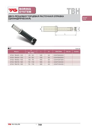 BORINGSYSTEM TBH ДВУХ-РЕЗЦОВАЯ ТОРЦЕВАЯ РАСТОЧНАЯ ОПРАВКА (ЦИЛИНДРИЧЕСКАЯ) Расточныесистемы ■ST Ед.изм.:мм D Модель L D1 ПЛАСТИНА Вес (кг) В наличии Мин - Макс ST32 TBH25 125 25 34 125 32 CCMT060200 ST32 TBH34 130 34 50 130 32 CCMT060200 ST32 TBH50 155 50 76 155 32 CCMT09T300 ST40 TBH76 185 76 116 185 40 CCMT120400 ST42 TBH76 185 76 116 185 42 CCMT120400 • 749