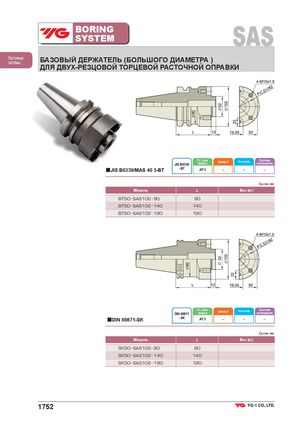 BORINGSYSTEM SAS РасточныесистемыБАЗОВЫЙ ДЕРЖАТЕЛЬ (БОЛЬШОГО ДИАМЕТРА ) ДЛЯ ДВУХ-РЕЗЦОВОЙ ТОРЦЕВОЙ РАСТОЧНОЙ ОПРАВКИ Ст. точн.JIS B6339конусаБалансир. G Частота вращ. Системаохлаждения ■JIS B6339/MAS 40 3-BT - BT AT3 – – – Ед.изм.:мм Модель L Вес (кг) BT50 SAS102 90 90 BT50 SAS102 140 140 BT50 SAS102 190 190 Ст. точн.DIN 69871конусаБалансир. G Частота вращ. Системаохлаждения ■DIN 69871-SK - SK AT3 – – – Ед.изм.:мм Модель L Вес (кг) SK50 SAS102 90 90 SK50 SAS102 140 140 SK50 SAS102 190 190 1752