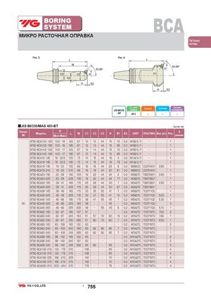 BORINGSYSTEM BCA МИКРО РАСТОЧНАЯ ОПРАВКА Расточные системы Рис. 3 Рис. 4 Ст. точн.JIS B6339конусаБалансир. G Частота вращ. Системаохлаждения - BT AT3 – – – ■JIS B6339/MAS 403-BT Ед.изм.:мм Конус№ Модель D LМин-МаксM C1 C2 C3 H E1 E2 UNIT ПЛАСТИНА Вес (кг) Рис. Вналичии BT50 BCA13.5 120 13.5 16 120 67 12 13 44 15 10 0.2 M1B2 E/F 1 BT50 BCA13.5 195 13.5 16 195 67 12 13 44 15 85 0.2 M1B2 E/F 1 BT50 BCA14.5 120 14.5 17 120 67 13 14 44 15 10 0.2 M1B2 E/F 1 BT50 BCA14.5 195 14.5 17 195 67 13 14 44 15 85 0.2 M1B2 E/F 1 BT50 BCA16 120 16 22.5 120 73 14 15 44 18 4 0.2 M1A2 E/F 1 BT50 BCA16 195 16 22.5 195 73 14 15 44 18 79 0.2 M1A2 E/F 1 BT50 BCA19 135 19 23 135 86 16 18 44 23 6 0.2 M2B2CC CCGT0401 3.80 1 BT50 BCA19 210 19 23 210 86 16 18 44 23 81 0.2 M2B2CC CCGT0401 1 BT50 BCA23 150 23 29 150 105 19 22 44 24 2 0.2 M3B2TC TBGT0601 3.90 1 BT50 BCA23 225 23 29 225 105 19 22 44 24 77 0.2 M3B2TC TBGT0601 1 BT50 BCA29 165 29 41 165 115 25 28 44 30 7 0.2 M3A2TC TBGT0601 4.50 1 BT50 BCA29 225 29 41 225 115 25 28 44 30 67 0.2 M3A2TC TBGT0601 1 BT50 BCA38 165 38 49 165 115 33 35 55 41 7 0.2 M5B2TC TCGT1102 1 BT50 BCA38 225 38 49 225 172 33 37 55 41 10 0.2 M5B2TC TCGT1102 5.00 1 BT50 BCA46 165 46 66 165 115 38 41 55 45 7 0.2 M5A2TC TCGT1102 5.20 1 50 BT50 BCA46 225 46 66 225 182 38 45 0.2 M5A2TC TCGT1102 3 BT50 BCA46 255 46 66 255 206 38 55 45 6 0.2 M5A2TC TCGT1102 5.70 1 BT50 BCA62 180 62 87 180 137 51 0.2 M7A2TC TCGT16T3 7.00 2 BT50 BCA62 240 62 87 240 184 51 57 70 60 13 0.2 M7A2TC TCGT16T3 7.60 1 BT50 BCA62 330 62 87 330 280 51 60 70 60 7 0.2 M7A2TC TCGT16T3 9.50 1 BT50 BCA83 165 83 108 165 122 63 0.2 M7A2TC TCGT16T3 2 BT50 BCA83 240 83 108 240 190 63 62 90 95 7 0.2 M7A2TC TCGT16T3 1 BT50 BCA83 345 83 108 345 295 63 62 90 95 7 0.2 M7A2TC TCGT16T3 1 BT50 BCA98 165 98 142 165 122 83 0.2 M10A2TC TCGT16T3 2 BT50 BCA98 240 98 142 240 197 83 0.2 M10A2TC TCGT16T3 2 BT50 BCA98 345 98 142 345 302 83 92 85 0.2 M10A2TC TCGT16T3 3 BT50 BCA132 210 132 176 210 108 65 0.2 M10A2TC TCGT16T3 4 BT50 BCA132 315 132 176 315 108 65 0.2 M10A2TC TCGT16T3 4 BT50 BCA166 225 166 210 225 142 70 0.2 M10A2TC TCGT16T3 4 BT50 BCA166 315 166 210 315 142 70 0.2 M10A2TC TCGT16T3 4 BT50 BCA200 210 200 244 210 176 75 0.2 M10A2TC TCGT16T3 4 • 755