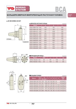 BORINGSYSTEM BCA БОЛЬШЕРАЗМЕРНАЯ МИКРОРЕЖУЩАЯ РАСТОЧНАЯ ГОЛОВКА Расточныесистемы ■ JIS B6339/MAS 403-BT ■ ДЕРЖАТЕЛЬ РАСТОЧНОГО КОЛЬЦА Ед.изм.:мм Модель d D L BT50 BRA140 105 140 197 105 BT50 BRA140 165 140 197 165 BT50 BRA191 105 191 248 105 BT50 BRA191 165 191 248 165 BT50 BRA242 105 242 299 105 BT50 BRA242 165 242 299 165 BT50 BRA293 105 293 350 105 BT50 BRA293 165 293 350 165 BT50 BRA344 105 344 401 105 BT50 BRA344 165 344 401 165 BT50 BRA395 105 395 452 105 BT50 BRA395 165 395 452 165 ■ПЕРЕХОДНИК ДЛЯ КОЛЬЦА Ед.изм.:мм Модель D(h6) L C1 C2 BT50 RAA32 60 32 60 102 82 BT50 RAA32 120 32 120 102 82 ■КОЛЬЦЕВАЯ ГОЛОВКА Ед.изм.:мм Модель D1 D(H7)Мин-МаксLC1 C2 H N MICROUNIT RH32 BCA140 32 140 197 45 102 82 14 M10A2TC RH32 BCA191 32 191 248 45 136 82 14 M10A2TC RH32 BCA242 32 242 299 45 184 82 14 103 M10A2TC RH32 BCA293 32 293 350 45 234 82 14 103 M10A2TC RH32 BCA344 32 344 401 45 284 82 14 103 M10A2TC RH32 BCA395 32 395 452 45 36 82 14 103 M10A2TC • 757