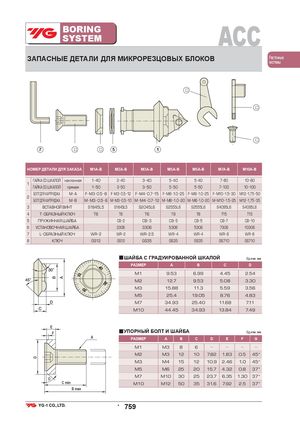 BORINGSYSTEM ACC ЗАПАСНЫЕ ДЕТАЛИ ДЛЯ МИКРОРЕЗЦОВЫХ БЛОКОВ Расточныесистемы 7 5 1 НОМЕР ДЕТАЛИ ДЛЯ ЗАКАЗА M1A-B M2A-B M3A-B M5A-B M5A-B M7A-B M10A-B ГАЙКА СО ШКАЛОЙ наклонная 1 40 2 40 3 40 5 40 5 40 7 80 10 80 1 ГАЙКА СО ШКАЛОЙ прямая 1 50 2 50 3 50 5 50 5 50 7 100 10 100 БОЛТ ДЛЯ КАРТРИДЖА M A F M3 0.5 8 F M3 0.5 12 F M4 0.7 15 F M6 1.0 25 F M6 1.0 25 F M10 1.5 30 M12 1,75 50 2 БОЛТ ДЛЯ КАРТРИДЖА MB M M3 0.5 6 M M3 0.5 10 M M4 0.7 12 M M6 1.0 20 M M6 1.0 20 M M10 1.5 25 M12 1,75 35 3 ВСТАВНОЙ ВИНТ S1845L5 S1845L5 S2045L6 S2555L6 S2555L6 S4095L6 S4095L6 4 Т ОБРАЗНЫЙ КЛЮЧ T6 T6 T6 T8 T8 T15 T15 5 ПРУЖИННАЯ ШАЙБА CB 2 CB 3 CB 5 CB 5 CB 7 CB 10 6 УСТАНОВОЧНАЯ ШАЙБА 2306 3306 5306 5306 7306 10306 7 L ОБРАЗНЫЙ КЛЮЧ WR 2 WR 2 WR 2.5 WR 4 WR 4 WR 6 WR 8 8 КЛЮЧ GS12 GS12 GS35 GS35 GS35 GS710 GS710 ■ШАЙБА С ГРАДУИРОВАННОЙ ШКАЛОЙ Ед.изм.:мм РАЗМЕР A B C D M1 9.53 6.99 4.45 2.54 M2 12.7 9.53 5.08 3.30 M3 15.88 11.3 5.59 3.56 M5 25.4 19.05 8.76 4.83 M7 34.93 25.40 11.68 7.11 M10 44.45 34.93 13.84 7.49 E F ■УПОРНЫЙ БОЛТ И ШАЙБА Ед.изм.:мм A РАЗМЕР A B C D E F G M1 M3 8 6 M2 M3 12 10 7.82 1.83 0.5 45˚ M3 M4 15 12 10.9 2.46 1.0 45˚ M5 M6 25 20 15.7 4.32 0.8 37˚ G M7 M10 30 25 23.7 6.35 1.30 37˚ C min M10 M12 50 35 31.6 7.92 2.5 37˚ B max • 759 D