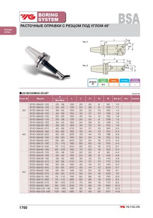 BORINGSYSTEM BSA РАСТОЧНЫЕ ОПРАВКИ С РЕЗЦОМ ПОД УГЛОМ 45° Расточные системы Рис. 1 Рис. 2 Ст. точн.JIS B6339конусаБалансир. G Частота вращ. Системаохлаждения - BT AT3 – – – ■JIS B6339/MAS 403-BT Ед.изм.:мм D Конус № Модель L C C1 W M Вес (кг) Рис. В наличии Мин-Макс BT30 BSA25 120 25 38 120 20 22 8 90 1.0 BT30 BSA30 135 30 42 135 24 26 8 105 1.1 30 BT30 BSA38 150 38 52 150 30 33 10 120 1.4 BT30 BSA42 150 42 56 150 34 37 10 125 1.6 BT30 BSA50 150 50 65 150 40 44 13 125 1.8 BT40 BSA25 135 25 38 135 20 22 8 108 1.3 BT40 BSA30 165 30 42 165 24 26 8 138 1.5 BT40 BSA38 180 38 52 180 30 33 10 153 1.8 BT40 BSA42 210 42 56 210 34 37 10 183 2.3 BT40 BSA50 180 50 65 180 40 44 13 153 2.4 40 BT40 BSA50 225 50 65 225 40 44 13 198 2.9 BT40 BSA62 180 62 90 180 50 54 16 153 3.2 BT40 BSA62 240 62 90 240 50 54 16 213 4.2 BT40 BSA72 180 72 110 180 60 63 19 153 4.4 BT40 BSA72 240 72 110 240 60 63 19 213 5.7 BT40 BSA90 180 90 125 180 75 63 19 153 5.4 BT50 BSA25 135 25 38 135 20 22 8 95 4.4 BT50 BSA30 165 30 42 165 24 26 8 125 4.6 BT50 BSA38 180 38 52 180 30 33 10 140 4.8 BT50 BSA42 210 42 56 210 34 37 10 170 5.0 BT50 BSA50 180 50 65 180 40 44 13 140 5.4 BT50 BSA50 240 50 65 240 40 44 13 200 5.7 BT50 BSA62 195 62 90 195 50 54 16 155 6.1 50 BT50 BSA62 270 62 90 270 50 54 16 230 7.5 BT50 BSA72 195 72 110 195 60 66 19 155 6.9 BT50 BSA72 285 72 110 285 60 66 19 245 9.3 BT50 BSA90 210 90 125 210 75 80 19 170 9.2 BT50 BSA90 300 90 125 300 75 80 19 260 12.3 BT50 BSA105 195 105 160 195 90 90 25 157 10.5 BT50 BSA105 285 105 160 285 90 90 25 247 14.8 1760