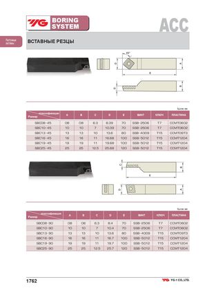 BORINGSYSTEM ACC РасточныесистемыВСТАВНЫЕ РЕЗЦЫ Ед.изм.:мм классификацияРазмерA B C D E ВИНТ КЛЮЧ ПЛАСТИНА SBC08 45 08 08 6.3 8.39 70 SSB 2506 T7 CCMT0602 SBC10 45 10 10 7 10.39 70 SSB 2506 T7 CCMT0602 SBC13 45 13 13 10 13.6 80 SSB 4009 T15 CCMT09T3 SBC16 45 16 16 11 16.68 100 SSB 5012 T15 CCMT1204 SBC19 45 19 19 11 19.68 100 SSB 5012 T15 CCMT1204 SBC25 45 25 25 12.5 25.68 120 SSB 5012 T15 CCMT1204 Ед.изм.:мм классификацияРазмер A B C D E ВИНТ КЛЮЧ ПЛАСТИНА SBC08 90 08 08 6.3 8.4 70 SSB 2506 T7 CCMT0602 SBC10 90 10 10 7 10.4 70 SSB 2506 T7 CCMT0602 SBC13 90 13 13 10 13.6 80 SSB 4009 T15 CCMT09T3 SBC16 90 16 16 11 16.7 100 SSB 5012 T15 CCMT1204 SBC19 90 19 19 11 19.7 100 SSB 5012 T15 CCMT1204 SBC25 90 25 25 12.5 25.7 120 SSB 5012 T15 CCMT1204 1762