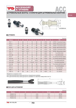 ACCESSORY& OTHERS ACC ШТРЕВЕЛЬНЫЕ БОЛТЫ И КЛЮЧИ ДЛЯ ШТРЕВЕЛЬНЫХ БОЛТОВ Аксессуары ■ШТРЕВЕЛИ Ед.изм.:мм Модель D d2 d1 d L l G O ТИП PS 1 15 23 17 10 60 35 M16 45˚ BT40 Ⅰstandard type PS 2 15 23 17 10 60 35 M16 60˚ BT40 Ⅱstandard type PS 5 23 38 25 17 85 45 M24 45˚ BT50 Ⅰstandard type PS 6 23 38 25 17 85 45 M24 60˚ BT50 Ⅱstandard type PS 16 11 16.5 12.5 7 43 23 M12 45˚ BT30 Ⅰstandard type PS 17 11 16.5 12.5 7 43 23 M12 60˚ BT30 Ⅱstandard type PS 0 23 38 25 17 85 45 M24 90˚ For BT50 OKK PS 08 15 23 17 10 60 35 M16 90˚ For BT40 OKK PS P 24 36 25 18 71 31 M24 90˚ For BT50 MITISUI SEIKI PS P5 15 23 17 10 50 25 M16 90˚ For BT40 MITISUI SEIKI PS G41 29 37 25 21 65.2 25.2 M24 45˚ For BT50 MAZAK PS G51 18.8 22 17 12.45 44.1 19.1 M16 45˚ For BT40 MAZAK PS S2 25 39 25 18 95 55 M24 60˚ For SHIN NIPPON KOKI PS F1 23 39 25 18 104 64 M24 45˚ For MITSUBISHI PS B1 22 38 25 16 112 72 M24 60˚ For OKUMA PSS 1 19 23 17 14 54 26 M16 75˚ For SK40 PSS 5 28 36 25 21 74 34 M24 75˚ For SK50 ▶Изделие на складском учете ▶По дополнительному заказу доступны специальные размеры ▶По дополнительному заказу доступны штревели со сквозным отверстием (тип Н). L ■КЛЮЧ ДЛЯ ШТРЕВЕЛЕЙ Ед.изм.:мм Модель D L Вес (кг) ДЛЯ PSWB 30 27 210 0.3 BT30 PSWB 40 37 230 0.4 BT40 PSWB 50 49 280 0.78 BT50 • 763 D+Ø,
