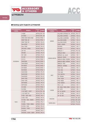 ACCESSORY& OTHERS ACC ШТРЕВЕЛИ Аксессуары ■ТАБЛИЦА ДЛЯ ПОДБОРА ШТРЕВЕЛЕЙ ПРОИЗВОДИТЕЛЬСТАНКА МОДЕЛЬ Конус№ ШТРЕВЕЛЬ ПРОИЗВОДИТЕЛЬСТАНКА МОДЕЛЬ Конус№ ШТРЕВЕЛЬ T 4000 BT30 PS 16 Any Mill LCV30A/B BT30 PS 17 DT 360D BT30 PS 16 Any Mill LCV55S BT50 PS 6 DNM 400II, 500II, 650II BT40 PSS 1 Any Mill LCV650S BT50 PS 5 DNM 750II/40 BT40 PSS 1 Any Mill ICV66 BT50 PS 5 SEMC DNM 750II/50 BT50 PS 5 Any Mill ICV80 BT50 PS 5 Mynx 6500 BT50 PS 5 DMC 3000 BT50 PS 0 Mynx 7500 BT50 PS 5 PCH40 BT40 PS 1 VM 5400 / 6500 BT40 PSS 1 PCH50 BT50 PS 5 VM 750 BT50 PS 5 SIRIUS 1 BT30 PS 16 VM 960 BT50 PS 5 SIRIUS 550 BT40 PS 1 VM 1260 BT50 PS 5 SIRIUS UL/ULG BT40 PS 1 VC 430 BT40 PSS 1 SIRIUS 7040 BT50 PS 0 HWACHEON VC 510 BT40 PSS 1 SIRIUS 650/650N BT50 PS 0 DOOSAN DVM 500II BT40 PSS 1 SIRIUS 850/850N BT50 PS 0 DVM 5650II BT40 PSS 1 SIRIUS 700 BT50 PS 0 NX 4500II BT40 PSS 1 SIRIUS 12580 BT50 PS 0 NX 5500II BT40 PSS 1 TCH 45 BT40 PS 1 NX 6500II BT40 PSS 1 TCH 50 BT50 PS 6 NHM 5000 BT50 PS 5 TCH 80 BT50 PS 6 NHM 6300 BT50 PS 5 TCH 80TS BT50 PS 6 S&T NHM 8000 BT50 PS 5 FX 500H BT40 PS 2 NHM 1000 BT50 PS 5 TNV 40A BT40 PS 1 NHM 1250 BT50 PS 5 TNV 80A BT40 PS 1 NHP 5000 BT50 PS 5 TNV 650V BT50 PS 6 NHP 6300 BT50 PS 5 TM 1/2 BT40 PS 1 HC 400II BT40 PSS 1 VF 4SS/3SS/2SS BT40 PS 1 HC 500II BT40 PSS 1 VF 2TR BT40 PS 1 HASS i CUT 380T / 420T BT30 PS 16 VF 5/50TR BT50 PS 5 i CUT 400T/M BT30 PS 16 VF 9/50 BT50 PS 5 F 400 / 500/ 650 BT40 PS 1 VF 8/50 BT50 PS 5 F 500/ 650 BT50 PS 5 BT40 PS G51 MAZAK F 510M / 550 / 660M BT40 PS 1 BT50 PS G41 WIA F 510B BT40 PS 1 BT40 PS 08 MORI SEKI F 600B / 750B / 960B BT50 PS 5 BT50 PS 51 KH 50G / 63G BT50 PS 5 KH 80G / 1000 BT40 PS 1 HS 5000 BT40 PS 1 HS 5000 / 6300 / 8000 BT50 PS 5 1764