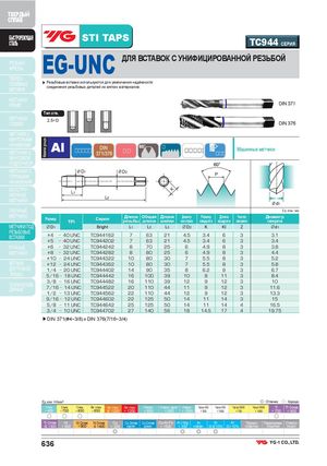 ТВЕРДЫЙ СПЛАВ БЫСТРОРЕЖУЩАЯСТАЛЬ STI TAPS TC944 СЕРИЯ РЕЗЬБО-ФРЕЗЫ EG-UNC ДЛЯ ВСТАВОК С УНИФИЦИРОВАННОЙ РЕЗЬБОЙ ТВЕРДО- СПЛАВНЫЕМЕТЧИКИ ▶ Резьбовые вставки используются для увеличения надёжностисоединения резьбовых деталей из мягких материалов. МЕТЧИКИ PRIME DIN 371 Тип отв. МЕТЧИКИ 2.5×DCOMBO DIN 376 МЕТЧИКИ С ВИНТОВЫМИ КАНАВКАМИ МЕТЧИКИ С Машинные метчики ВИНТОВОЙ ПОДТОЧКОЙ МЕТЧИКИ С D1 D2ПРЯМЫМИ P КАНАВКАМИ БЕССТРУ-ЖЕЧНЫЕМЕТЧИКИ L1 L2 K d1 ГАЕЧНЫЕ Ед. изм.: мм МЕТЧИКИ Размер TPI Серия Длина Общая Длина Диаметр Размер Длина ЧислорезьбыдлинашейкихвостовикаквадратаквадратаканавокДиаметрсверла МЕТЧИКИ ПОД ØD1 Bright L1 L2 L3 ØD2 K KI Z Ød1 РЕЗЬБОВЫЕ ВСТАВКИ #4 40 UNC TC944162 7 63 21 4.5 3.4 6 3 3.1 #5 40 UNC TC944202 7 63 21 4.5 3.4 6 3 3.4 РУЧНЫЕ #6 32 UNC TC944242 8 70 25 6 4.9 8 3 3.8 МЕТЧИКИ #8 32 UNC TC944282 8 80 25 6 4.9 8 3 4.4 #10 24 UNC TC944322 10 80 30 7 5.5 8 3 5.2 МЕТЧИКИ #12 24 UNC TC944362 10 80 30 7 5.5 8 3 5.8 ДЛЯ ТРУБНОЙ 1/4 20 UNC TC944402 14 90 35 8 6.2 9 3 6.7 РЕЗЬБЫ 5/16 18 UNC TC944442 16 100 39 10 8 11 3 8.4 ТЕХНИЧЕСКИЕДАННЫЕ 3/8 16 UNC TC9444827/1614 UNCTC944522 16 110 392011044 1211 9 12 39123 1011.6 1/2 13 UNC TC944562 22 110 44 12 9 12 3 13.3 9/16 12 UNC TC944602 22 125 50 14 11 14 3 15 5/8 11 UNC TC944642 25 125 50 14 11 14 4 16.5 3/4 10 UNC TC944702 27 140 56 18 14.5 17 4 19.75 ▶DIN 371(#4~3/8) и DIN 376(7/16~3/4) Ед.изм: Н/мм2 ◎ : Отлично ◯ : Хорошо Сталь Сталь Сталь Лег. сталь Лег. сталь Лег. сталь Нерж. Нерж. ауст. Нерж. Чугун GG Чугун GG Чугун GGG Чугун GGG Ti Ti Сплав < 400 < 700 < 850 < 850 ≤ 1200 > 1200 < 850 < 850 < 1000 < 500 < 1000 < 700 < 1000 < 700 < 900 ○ ○ ○ ○ Ti Сплав Ni Ni Сплав Ni Сплав Cu Cu Сплав Cu Сплав Cu-Al-Fe Al / Mg Al Al Al Термо- Термореак. Стекло- ≤ 1300 < 500 < 900 ≤ 1400 < 350 коротк. длинн. < 1500 < 350 кован. Si≤10% Si>10% пластик пластик пласт. ◎ ◎ ◎ ◎ 636