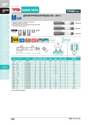 ТВЕРДЫЙ СПЛАВ БЫСТРОРЕЖУЩАЯСТАЛЬ HAND TAPS T7343 СЕРИЯ РЕЗЬБО-ФРЕЗЫ M-LH ДЛЯ МЕТРИЧЕСКОЙ РЕЗЬБЫ ISO – DIN 13 ТВЕРДО- СПЛАВНЫЕМЕТЧИКИ ▶ Данные метчики идут в комплекте из трёх штук(черновой, средний и чистовой).▶Для окончательного точного нарезания внутреннейрезьбыЧерновой МЕТЧИКИ используется чистовой метчик. PRIME Средний Тип отв. МЕТЧИКИ 2.0×D COMBO Чистовой МЕТЧИКИ С ВИНТОВЫМИ КАНАВКАМИМЕТЧИКИ С SS DIN32 6 Комплектметчиков ВИНТОВОЙ ПОДТОЧКОЙ МЕТЧИКИ С D1 D2ПРЯМЫМИ P КАНАВКАМИ БЕССТРУ-ЖЕЧНЫЕМЕТЧИКИ L1 L2 K d1 ГАЕЧНЫЕ Ед. изм.: мм МЕТЧИКИ Размер Шаг Серия Длина Общая Длина Диаметр Размер Длина ЧислорезьбыдлинашейкихвостовикаквадратаквадратаканавокДиаметрсверла МЕТЧИКИ ПОД ØD1 P Bright L1 L2 L3 ØD2 K KI Z Ød1 РЕЗЬБОВЫЕ ВСТАВКИ M3 0.5 T7343209 11 40 18 3.5 2.7 6 3 2.5 M3.5 0.6 T7343229 13 45 21 4 3 6 3 2.9 РУЧНЫЕ M4 0.7 T7343249 13 45 21 4.5 3.4 6 3 3.3 МЕТЧИКИ M4.5 0.75 T7343269 16 50 25 6 4.9 8 3 3.7 M5 0.8 T7343289 16 52 26 6 4.9 8 3 4.2 МЕТЧИКИ M6 1 T7343319 18 56 27 6 4.9 8 3 5 ДЛЯ ТРУБНОЙ M8 1.25 T7343369 20 63 34 6 4.9 8 3 6.8 РЕЗЬБЫ M10 1.5 T7343429 22 70 38 7 5.5 8 4 8.5 ТЕХНИЧЕСКИЕДАННЫЕ M12 1.75M142 T7343509 24 80 45 9 7 10 4T734354926804511912410.212 M16 2 T7343609 27 80 45 12 9 12 4 14 M18 2.5 T7343659 30 95 58 14 11 14 4 15.5 M20 2.5 T7343709 32 95 58 16 12 15 4 17.5 M22 2.5 T7343749 32 100 62 18 14.5 17 4 19.5 M24 3 T7343789 34 110 69 18 14.5 17 4 21 M27 3 T7343869 36 110 69 20 16 19 4 24 M30 3.5 T7343949 40 125 77 22 18 21 4 26.5 ▶ LH=Left hand thread 642