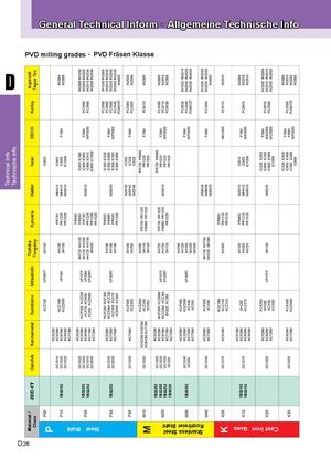 Steel · StahlStainless SteelRostfreier StahlCast iron · Guss D 26 D PVD milling grades · PVD Fräsen Klasse GGeenneraelrTaurlniTnge/cAhllgnemiceianel DInrefhoberamrbe·ituAngl,lIgSOemKeennizneeichTnuencg hnische Info Technical Info Technische Info Material / Class ZCC-CT Sandvik Kennametal Sumitomo Mitsubishi ToshibaTungaloy Kyocera Walter Iscar SECO Korloy IngersollTague Tec P P05 ACZ120 VP05HT GH130KC522M IC903 GC1010P10YBG102GC1025GC1020KC525MKC610MKC643MACZ10MACZ20WVP10H AH120GH130 PR730 WHX15PR1225WHH15PR1525WXM15IC903IC950IC1008F15M IN2004IN2006 KC715M P20 YBG202YBG252 GC1020GC1025GC1010GC2030KC522MKC525MACP200ACZ330 VP15TFKC643MACX70ACW30VP20MKC715MAC350ACZ50MVP20RTKC725MAH725AH120AH130AH330AH725AH730GH330PR630PR830PR730PR1225PR1230PR1525IC810 IC380IN2006 IN1030WXM15IC830 IC900F25MIC908 IC910MP3000PC3500IN2004 IN2005PC3600IN2015 IN2030IC950 IC1008IN2505 IN2540 P30 YBG302 GC1030GC2030 KC530MKC725MKC735MACP200ACP300ACZ50MACZ330ACZ350ACX70ACW30AC350VP30RTAH740AH130AH140PR630PR660PR830PR1230WXM35IC300 IC328IC830 IC900IC928 IC350IC808 IC908F30MMP3000PC3500IN1030 IN2005PC3600IN2015 IN2030PC5300IN2035 IN2040PC3545IN2505 IN2530PC9570TIN4035 P40 GC1030 KC735M ACP300ACZ350 AH140AH750 WXP45 IC300WSP45IC328WSP46IC928F40M PC5300PC3545 IN2035IN2040 M M10 GC1020 KC522M KC610MKC643M KC715MACZ20WACZ350EH20Z AH330GH110GH130PR730PR1225PR660PR1525 PR730 PR660PR1225 F15M PC8110 IN2505PR1525 YBG202M20YBG205YBG252YB9320GC1020GC1025GC1030GC203KC522MKC525MKC610MKC715MACP200ACZ50MACZ20MACZ350EH20ZAC350VP15TFVP20RTKC725MAH725AH730GH110PR730PR1025PR660PR1225WXM15PR1525PR730PR660PR1025F25MPR1225MP3000PR1525PC5300PC8110PC9530IN2005IN2015IN2505 KC525MM30YBG302GC1040GC203KC530MKC725MKC735MACP300ACZ50MACX80AC350VP30RTAH740AH120AH130GH330GH340 F30MMP3000 PC9530 IN1030 IN2015PC3545IN2030IN2035PC9570TIN2530IN4035 M40 GC1040 KC530MKC735M ACP300ACX80 AH140 AH750GH330GH340 WSM35WSM36WXM35 IN1030 IN2030F40MPC3545IN2035IN2530IN4035 ACZ10M PR905 K K05 GC1010 KC510M ACZ120ACZ310 AH330 PR1210PR1510 MH1000 PC8110 IN2510 KC510MK10YBG102YBG152GC1010KC520MKC620MEH20ZACZ310KC643MAH120AH330AH725PR905 WXH15PR1210WHH15PR1510WXM15IC810IC950IC1008F15MMK2000PC6510 IN2004IN2010IN2510 K20 KC520MGC1020KC620MKC725MACK300EH20ZACX80ACW30VP15TF GH130 WKK25 IC328 IC830IC950IC350IC808IC908IC1008F25MMK2000MO3000PC6510PC5300IN1030IN2004IN2010IN2015IN2030IN2505 K30 GC1020 KC620MKC725M ACK300ACZ50M IC328 IC830IC900IC908IC350IC808IC908F30MF40MMP3000PC5300PC9570TIN2005IN2015IN2030IN2505