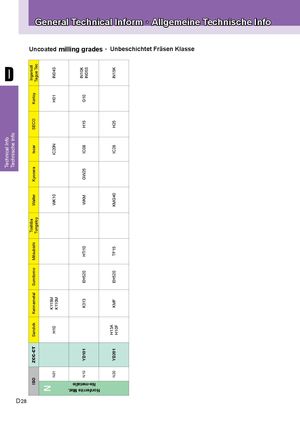 Nonferrite Mat. Ne-metalle D 28 D KlasseFräsenUnbeschichtet·gradesmillingUncoated GGeenneraelrTaurlniTnge/cAhllgnemiceianel DInrefhoberamrbe·ituAngl,lIgSOemKeennizneeichTnuencg hnische Info Technical Info Technische Info ISO ZCC-CT Sandvik Kennametal Sumitomo Mitsubishi ToshibaTungaloyWalter Kyocera Iscar SECO Korloy IngersollTague Tec N N01 H10 K115MK110M WK10 IC20N H01 IN04S N10 YD101 K313 EH520 HTi10 WKM GW25 IC08 H15 G10 IN10KIN05S N20 YD201 H13AH10F KMF EH520 TF15 KMG40 IC28 H25 IN15K